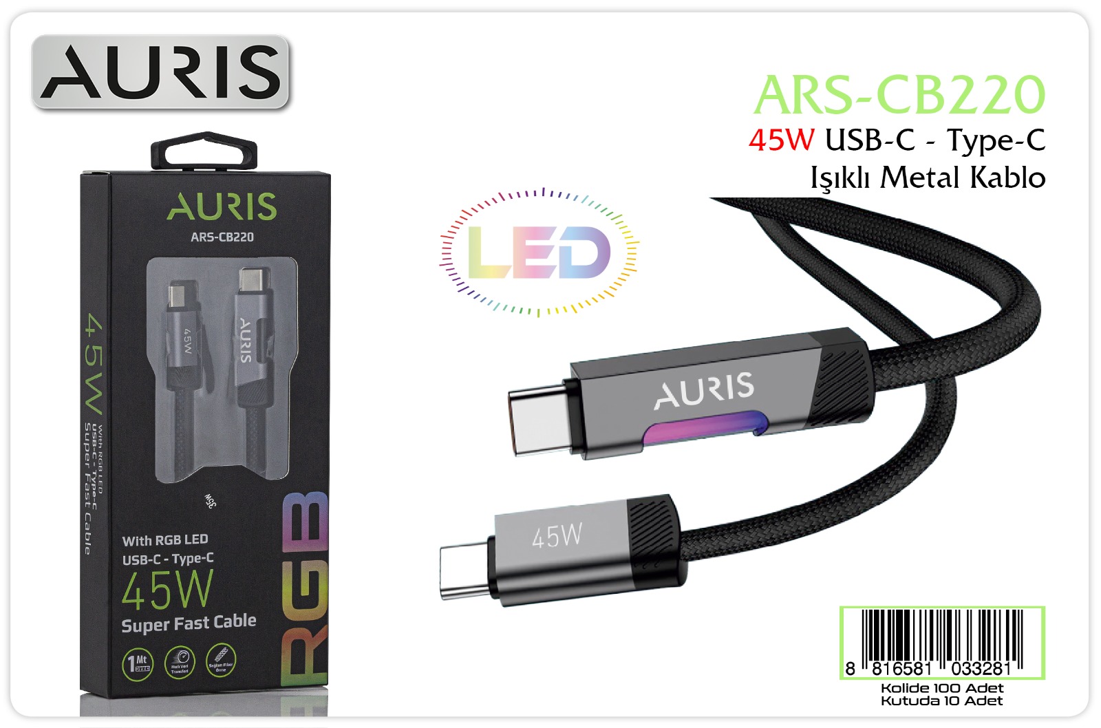 • Auris CB220 45W Type-C To Type-C Rgb Işıklı Metal Kablo